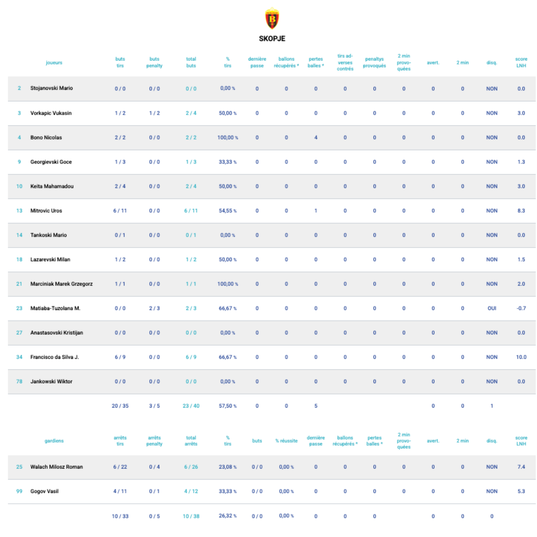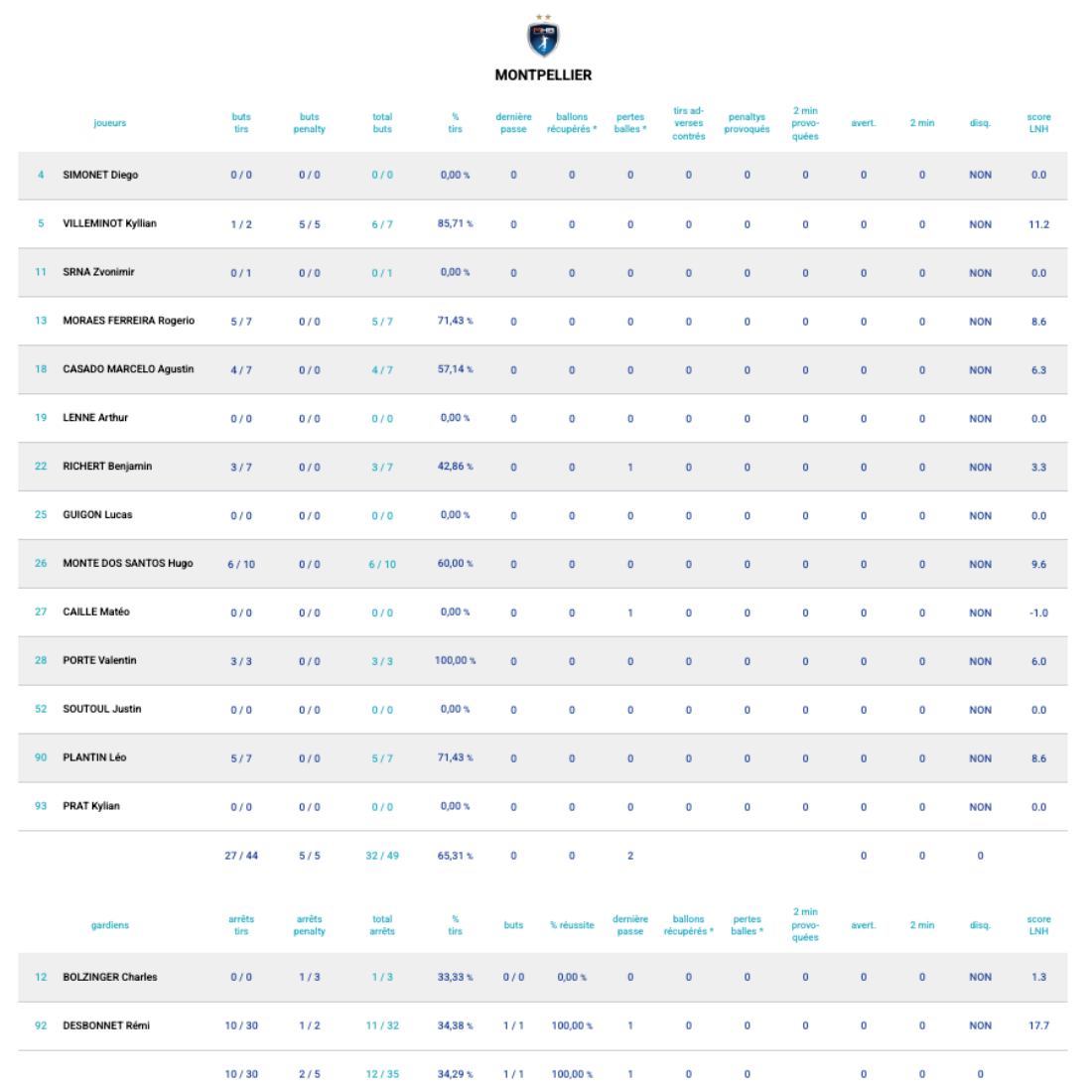 À la pause, le score est serré : 12-10. Au niveau des stats, Monte a trouvé les filets à cinq reprises (5/6) et Desbonnet est à 5/14 arrêts soit 36% de réussite.